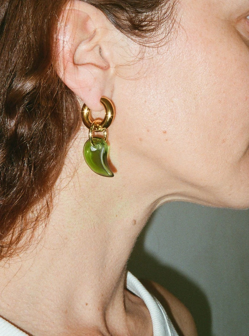 Par de argollas de acero quirúrgico doradas con dijes magatama de vidrio color verde. Terminaciones enchapadas en 18k.