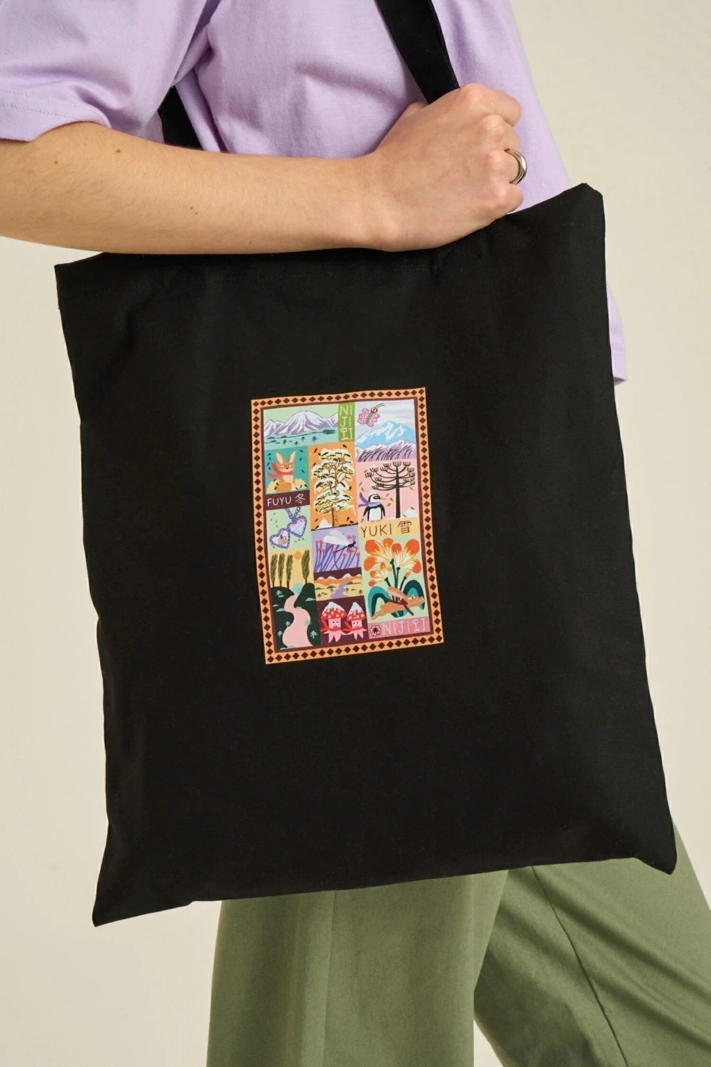 Está confeccionado en tejido *Good Denim by Santista y es de 100% algodón.En una de sus caras tiene un bordado kanji y en la otra una Etiqueta ilustrada por Agus Ramos.