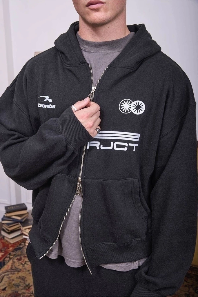 Campera gris melange con capucha y cierre doble carril. Estampa en frente.