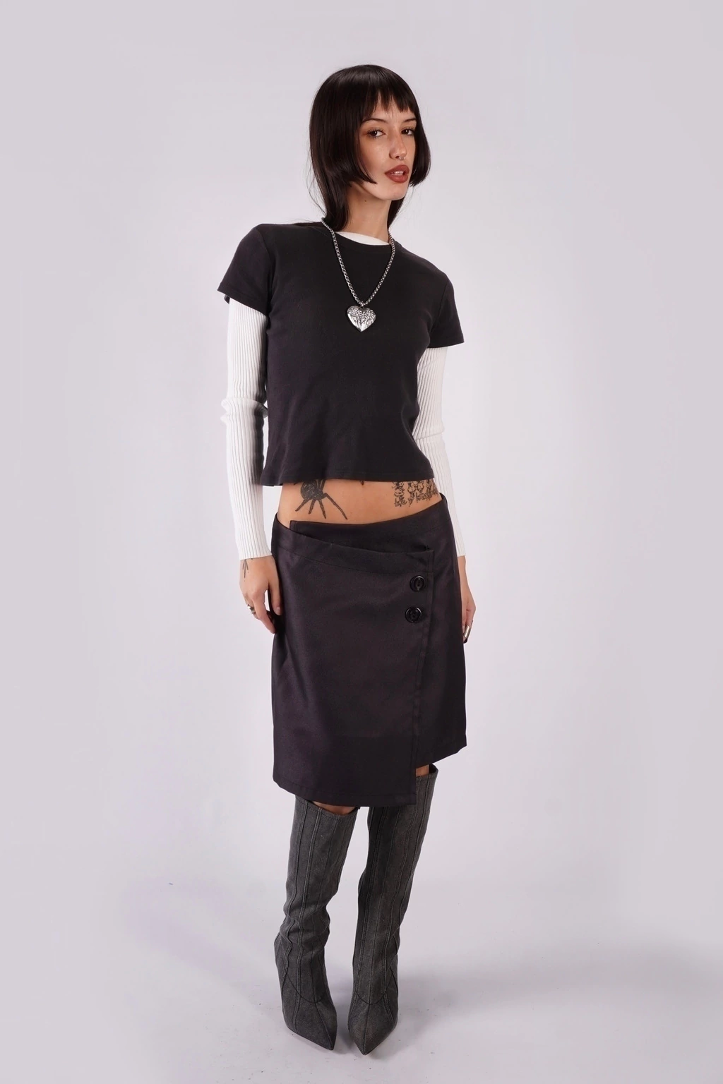 Falda sastrera hasta arriba de la rodilla con botones decorativos y ganchos funcionales de cerrado.