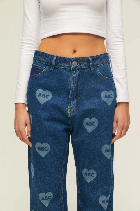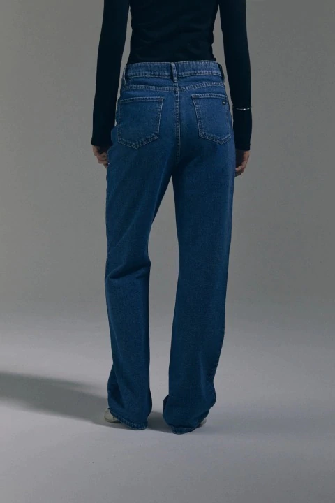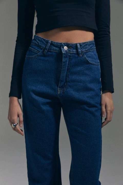 Denim rígido. Piernas rectas y anchas. Tiro alto o caído, según el talle. Calce recto.